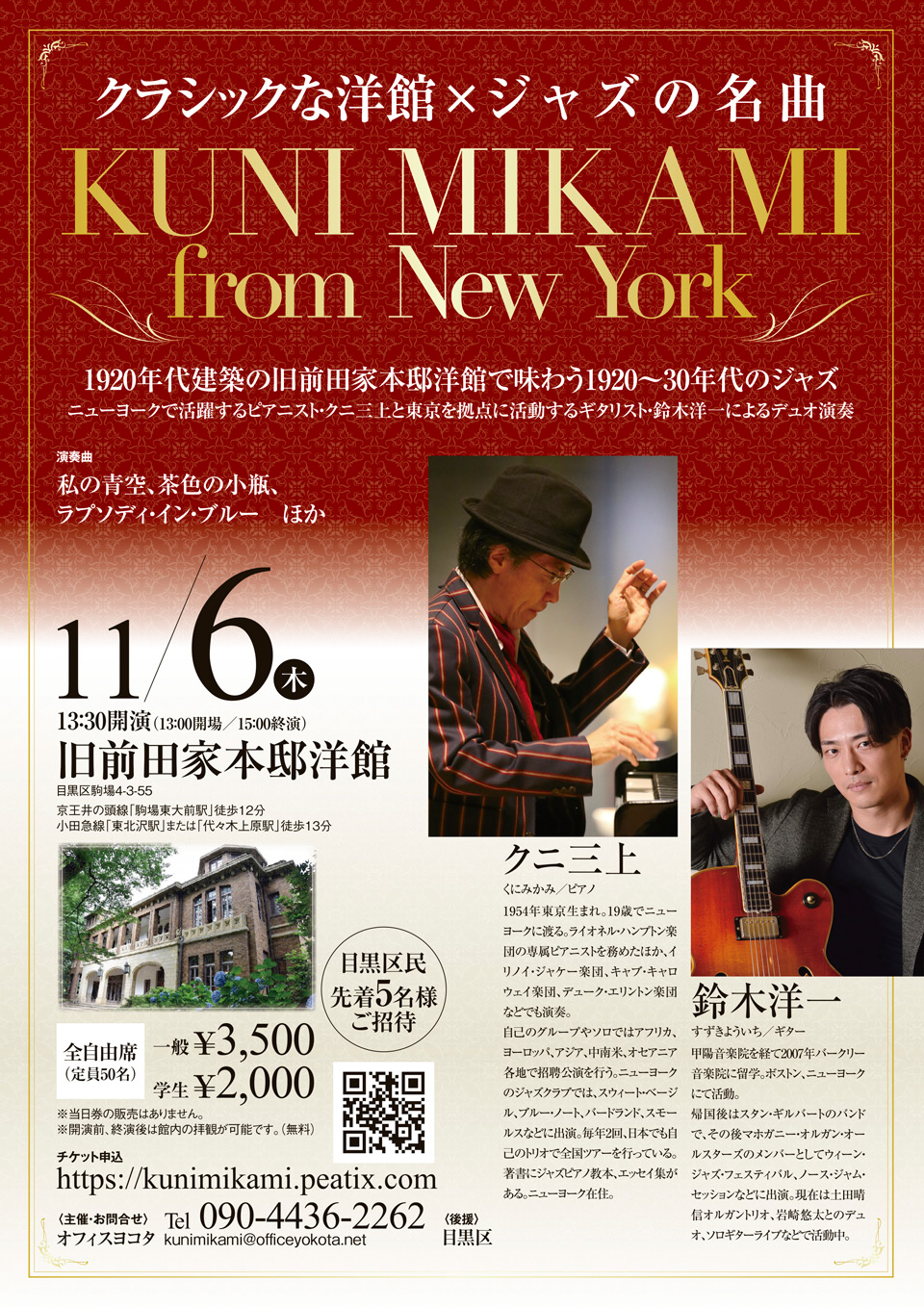 目黒区駒場・旧前田家本邸洋館 https://www.syougai.metro.tokyo.lg.jp/sesaku/maedatei.html 「クラシックな洋館×ジャズの名曲」 13:30-15:00(13:00 開場) 一般¥3,500 学生¥2,000 目黒区民先着5名様ご招待 チラシはこちら 【チケット】 https://kunimikami.peatix.com 【問合せ】オフィスヨコタ Tel 090-4436-2262 |